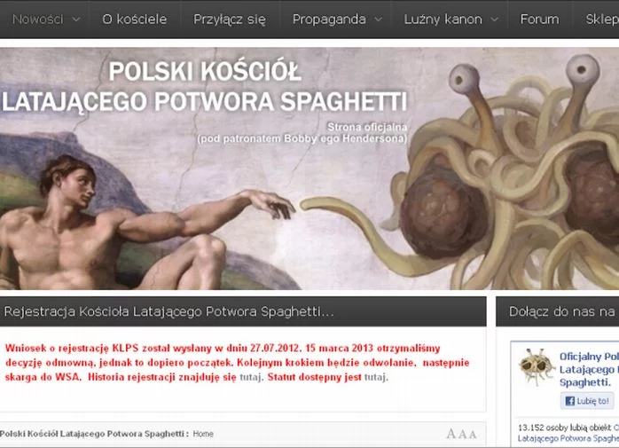 Ministerstwo Administracji i Cyfryzacji odmówiło wpisania do rejestru Kościołów i innych związków wyznaniowych Kościoła Latającego Potwora Spaghetti.
