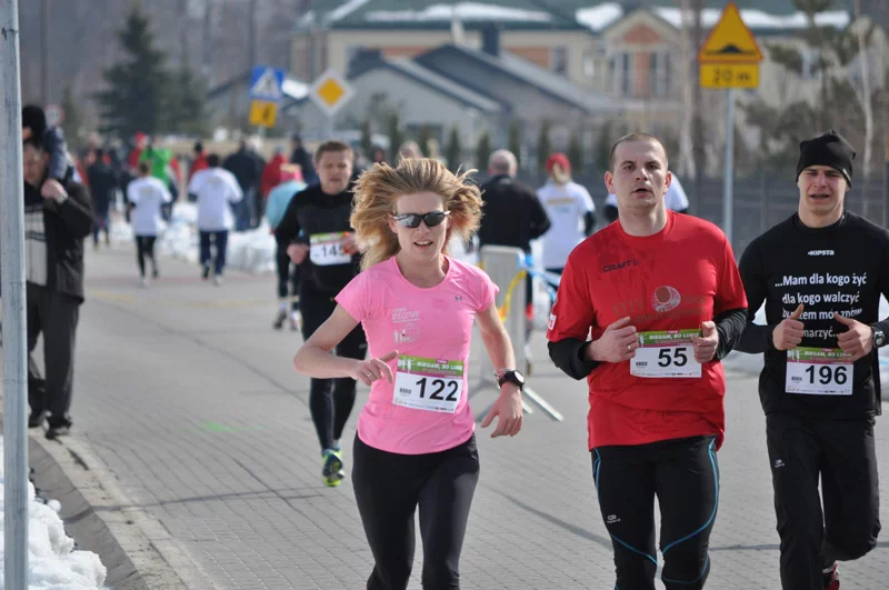 A potem nastąpił start. Tak trochę znienacka, ale konkretnie, wystrzelił pistolet i poszli... Niektórzy dosłownie poszli, bo zdaje się pierwszy raz startowali i musieli się ustawić na czele... Przez pierwsze pół kilometra trzeba się było troszkę poprzepychać w tłumie, a nei brakowało takich kwiatków jak kręcenie kamerką czy wiąznie butów na środku trasy... A nawet na fast tracku... Ale co tam. Ruszyliśmy z małżonkiem. Ostro. Jak po 500 metrach zorientowałam się, że zasuwamy szybciej niż ja wczoraj na tym Cooperze – lekko odpuściłam. Mąż nie – więc szybciutko mi uciekł. Ale ja też szybciutko zyskałam bardzo sympatyczne męskie towarzystwo, w którym poginałam już prawie do końca. Gdzieś w okolicach czwartego kilometra usłyszałam, że jestem druga z kobiet. Lekko się zdziwiłam, po czym doszłam do wniosku, że chyba już nie mam siły... I wtedy jeden z moich towarzyszy powiedział, że jak utrzymamy tempo to zrobi życiówkę, a drugi zapytał, w ile się biegnie takie 10 km, bo on pierwszy raz.... Spojrzałam na zegarek. Gdybyśmy utrzymali tempo – to ja też miała duże szanse na życiówkę. Poczułam brzemię odpowiedzialności za życiówkę – nie swoją. 5 km – 22 minuty. Szło dobrze, tylko zaniepokoiło mnie, że 5. km wypadł... sporo za półmetkiem. Znaczy się, 10 km to tu raczej nie ma. No, ale ja dalej biegnę na tym drugim miejscu.
