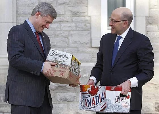 Amerykański ambasador David Jacobson pojawił się w piątek w rezydencji kanadyjskiego premiera i przed kamerami telewizyjnymi przekazał Harperowi wygraną: skrzynkę z 24 butelkami piwa Molson Canadian, wytwarzanego przez najstarszy kanadyjski browar.