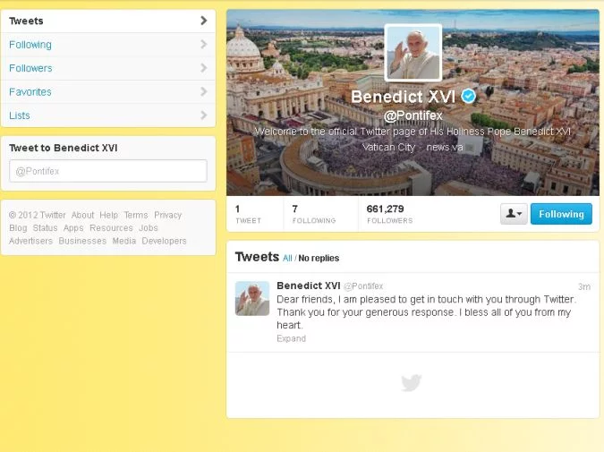 "Drodzy przyjaciele, cieszy mnie, że mogę się z wami porozumiewać na Twitterze" - tymi słowami papież Benedykt XVI zadebiutował na portalu społecznościowym Twitter.